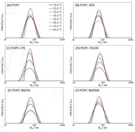 Distribution of the hydrodynamic radii Rh of POPC liposomes in 5 mM TRIS buffer suspensions (pH = 8) at different temperatures (indicated in the plots); (A) pure POPC suspensions; (B) POPC suspensions with added SDS; (C) POPC suspensions with added CPC; (D) POPC suspensions with added TX100; (E) POPC suspensions with added NaPSS; and (F) POPC suspensions with added NaPMA. The nominal POPC concentration was cPOPC = 132 µM and the nominal compound:POPC molar ratio was 1:1. Temperature legend is the same for all Figures.