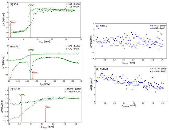 Enthalpograms obtained by titrating (A) SDS; (B) CPC; (C) TX100; (D) NaPSS; and (E) NaPMA solution (empty circles) into 0.66 mM POPC suspension (filled circles) in 5 mM TRIS buffer. The vertical dashed lines indicate the surfactant’s CMC and the red arrows indicate the concentration of POPC (cPOPC). All data were collected on the VP–ITC calorimeter at 15 °C.