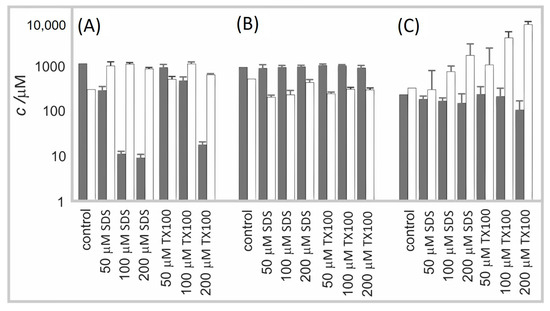The FCM analysis of the effect of surfactants SDS and TX100 on (A) erythrocyte suspension; (B) culture of microalgae Phaeodactylum tricornutum; and (C) culture of microalgae Dunaliella tertiolecta. The number density of cells is shown by gray bars and the number density of EPs by white bars.