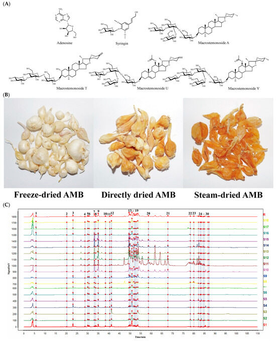 Fresh AMB from different origins in China were processed into various products using the following methods: (1) AMB was pre-cooled at −20 °C and then placed in a LYO QUEST-55 vacuum freeze-dryer (Telstar Co., Ltd., Terrassa, Spain), where it was lyophilized to obtain freeze-dried AMB; (2) AMB was placed in a DHG-9070A electrically heated constant-temperature blower drying oven (Shanghai Shenxian Thermostat Equipment Factory, Shanghai, China), and the moisture within the herbs was removed at 50 °C to obtain directly dried AMB; (3) AMB was put into a steamer and steamed through and the surface water was wiped off. The remaining water in the herb was then removed using an electrically heated blast dryer at 50 °C to obtain steam-dried AMB. The different processed products of AMB in each production area are detailed in Table 1 (Numbered S1–S18). The appearance properties of the three processed products are shown in Figure 1B.