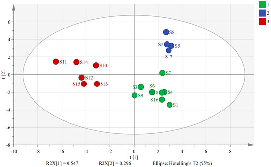 Plot of PCA scores for 18 batches of AMB of different origins and processing methods (1: AMB treated via direct drying and post-steaming drying in northern production areas; 2: AMB treated via freeze-drying in northern production areas; 3: AMB in southern production areas).