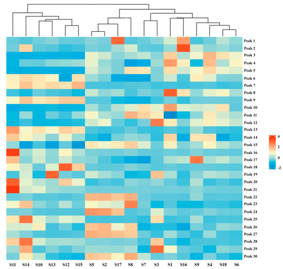 HCA, an unsupervised clustering method, constructs nested trees of clusters by assessing similarities based on squared Euclidean distances [26,27]. Using Origin Pro software (https://www.originlab.com/) and the peak areas of the 30 shared peaks as variables, we clustered AMB from various origins and processing methods. The resulting heat maps, which depict the impact of variables on clustering, are presented in Figure 3. The 18 sample batches were broadly divided into two clusters: AMB from southern Chinese provinces (S10–S15) and AMB from northern provinces (S1–S9 and S16–S18). Notably, within the northern provinces, a further subdivision emerged into two distinct clusters: AMB processed via freeze-drying (S2, S5, S8, and S17) and those processed through direct drying or post-steaming drying methods (S1, S3, S4, S6, S7, S9, S16, and S18). These findings align with the outcomes of the PCA analysis. The HCA results highlighted that differences in AMB components were significantly influenced by both origin and processing methods, potentially related to regional climate and soil variations between northern and southern China. Furthermore, distinctions between AMB batches may also correlate with the application of heat during processing.