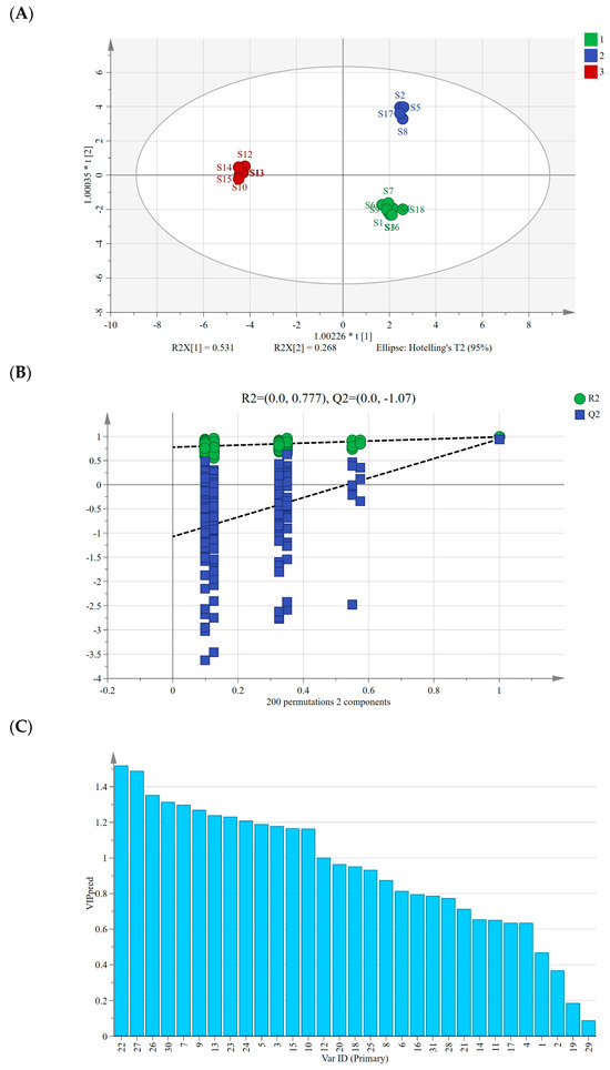 (A) Plot of OPLS-DA scores for AMB of different origins and processing methods. (B) Model cross-validation plot. (C) VIP values for 30 shared peaks.