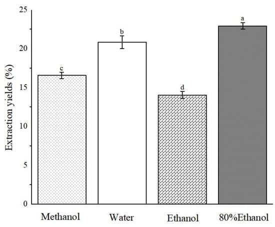Through examination of various plant species, we discerned a discernible pattern as follows: polar solvent extracts frequently exhibited antioxidant activity [,,]. Therefore, in this study, ABAP were extracted using a range of solvents, namely, methanol, water, ethanol, and 80% ethanol, with the objective of analyzing the content of various active ingredients and antioxidant properties present in the four solvent extracts. Following the completion of the extraction process, we employed vacuum distillation to thoroughly evaporate the residual solvent. Rigorous protocols were implemented in subsequent steps to guarantee the complete elimination of solvent residues, thereby mitigating any adverse effects on our experimental outcomes or their potential applications. As evident from Figure 2, the 80% ethanol extract achieved the highest extraction rate, reaching 22.96% ± 0.43, closely trailed by aqueous and methanol extracts. In contrast, the ethanol extract displayed the lowest extraction rate, at a mere 14.06% ± 0.47. Notably, there is a substantial variation in the yield of extracts obtained using different solvents. It is noteworthy that solvents containing water exhibited a higher extraction rate, which can likely be attributed to the high polarity of water, enabling it to dissolve impurities such as pigments and pectin more efficiently. This observation emphasizes the crucial role of solvent selection in enhancing the efficiency of extracting bioactive compounds from plant materials.