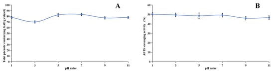 Assessment of pH stability of methanol extract of Anemone baicalensis aerial part using TPheC (A) and ABTS (B) assays. TPheC: total phenolic content; ABTS: 2,2′-Azino-bis(3-ethylbenzothiazoline-6-sulfonicacid) diammonium salt.