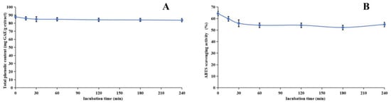 Assessment of thermal stability of methanol extract of Anemone baicalensis aerial part using TPheC (A) and ABTS (B) assays. TPheC: total phenolic content; ABTS: 2,2′-Azino-bis(3-ethylbenzothiazoline-6-sulfonicacid) diammonium salt.