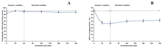 Assessment of in vitro simulated human digestive system on stability of methanol extract of Anemone baicalensis aerial part using TPheC (A) and ABTS (B) assays. TPheC: total phenolic content; ABTS: 2,2′-Azino-bis(3-ethylbenzothiazoline-6-sulfonicacid) diammonium salt.