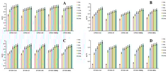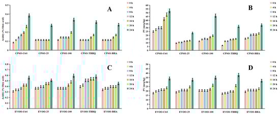 Changes in conjugated dienes (K232) and trienes (K270) levels in CPSO (A,B) and EVOO (C,D) supplemented with synthetic antioxidants, TBHQ and BHA, and varying concentrations of methanol extract of Anemone baicalensis aerial part at 160 °C. CPSO: cold-pressed sunflower oil; EVOO: extra virgin olive oil; TBHQ: tertiary butylhydroquinone; BHA: butyl hydroxyanisole.