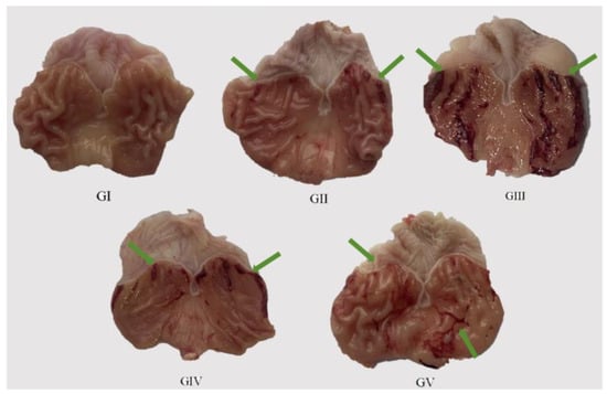 Macroscopic images of representative gastric tissues from each treatment group. Green arrow: bleeding bands and punctate ulcers.