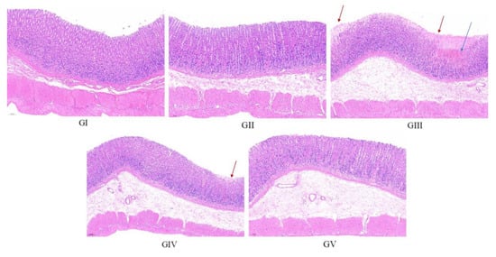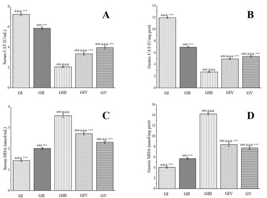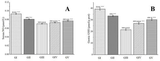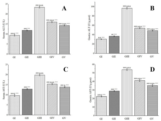 Alanine aminotransferase (ALT), predominantly located in the liver, heart, and skeletal muscle, undergoes an elevation in blood levels subsequent to damage or necrosis of liver cells or certain tissues []. Aspartate aminotransferase (AST), a mitochondrial enzyme, can be influenced by ethanol metabolism, which elicits oxidative stress and lipid peroxidation reactions. These reactions, consequently, impair mitochondria, leading to a surge in AST levels []. As cells sustain damage or necrosis, both ALT and AST levels increase, rendering them valuable biomarkers for assessing the extent of gastric tissue damage. As depicted in Figure 10, rats in group IV and group V exhibited significantly lower serum and gastric tissue levels of ALT and AST compared to those in group III. Notably, in gastric tissue, the ALT activity in group IV and group V rats was 56.00% and 50.55% of that observed in group III, respectively. Similarly, AST activity was 76.34% and 65.63% of group III’s levels, respectively. These findings indicate that a high dose of the methanol extract demonstrates a superior therapeutic effect on ethanol-induced gastric ulcers.