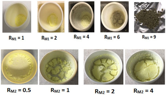 Composite 1 series—Ga0.9In0.1N/YAG:Ce. Ga0.9In0.1N NPs were dispersed in ethanol (10 mg/mL) and four solutions of YAG:Ce precursors were prepared. The latter were added to the former and at the end the urea was added to the mixture (R = 1, where R = (Al3+ + Y3+ + Ce3+/urea). The molar ratio between the components is defined here as YAG:Ce/Ga3+, referred to as RM2 = 0.5, 1, 2, and 4. The dispersions were transferred in crucibles and prepared for the heat treatment: 900 °C, a ramp temperature of 6 °C/min, and a dwelling time of 1 h. The Ga0.9In0.1N NP dispersion and the Ga0.9In0.1N NPs + YAG:Ce precursors and urea dispersion are represented in Figure S6 (Supplementary Materials). The obtained samples have a similar yellow colour (Figure 4).