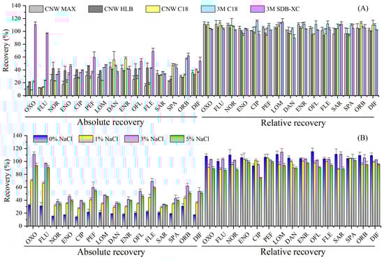 The selection of disk adsorbents plays a key role in improving both the enrichment and purification efficiency of target compounds in a complex matrix [,]. Five commercial SPE disks, including CNW MAX (mixed-mode cation exchange), CNW HLB (hydrophilic-lipophilic-balanced reverse phase polymer), CNW C18 (octadecyl), 3M C18 and 3M SDB-XC (polystyrenedivinylbenzene), were evaluated for the extraction of ultrapure water spiked with 20 ng/L of QNs (pH = 3, 3% NaCl) by the external standard method (absolute recovery) and the internal standard method (relative recovery). As shown in Figure 1A, the 3M SDB-XC disk had the highest absolute recoveries for the 15 QNs (range: 33–111%, mean: 55%), followed by 3M C18 (21–57%, 38%), CNW HLB (11–46%, 34%), CNW C18 (9–58%, 30%), and CNW MAX (12–45%, 27%), and the extraction efficiencies of 3M SDB-XC for OXO and FLU were significantly higher than those of the other four disks. It is worth noting that all five test disks obtained satisfactory relative recoveries (90–116%) after using internal standard correction, which may be attributed to the same molecular structures between the target compounds and their isotope-labeled internal standards (ILISs), as they exhibit the same adsorption properties during extraction and purification []. Therefore, the 3M SDB-XC disk was chosen in this study.
