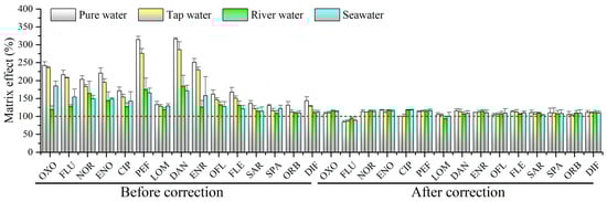 UPLC–MS/MS is a powerful analytical technique due to its high sensitivity and selectivity, but it is susceptible to matrix effects (signal suppression/enhancement) []. In this study, the matrix effects (ME) were calculated using the formula ME (%) = (Re − R0)/Rs × 100%, where Re, R0 and Rs were the signal intensity of spiked extracts, unspiked extracts and standard solution, respectively []. An ME value of 100% indicates no matrix effect, while values below 100% designate signal suppression, and values above 100% mean signal enhancement. As shown in Figure 2, signal enhancement was observed for the target 15 QNs, ranging from 108% to 316% in pure water, tap water, river water, and seawater. However, the matrix effects of the 15 QNs were minimized or eliminated by using the corresponding internal standard correction. It was demonstrated that the use of ILISs can effectively minimize/eliminate the matrix effect, without requiring any other processing, such as matrix calibration.