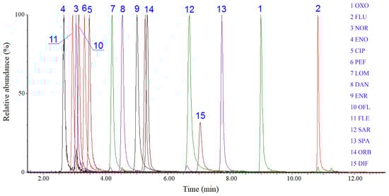 The developed automated disk-based SPE–UPLC–MS/MS method was validated in terms of linearity, limit of detection (LOD), limit of quantitation (LOQ), enrichment factors (EFs), and precision under optimum conditions [] (Table 1). The calibration curves were constructed using each analyte’s concentration versus the peak area ratio of the target analyte to its corresponding ILIS. Wide linearity was achieved in the range of 0.05–100 μg/L for the 15 QNs, with correlation coefficients (r2) ranging from 0.9992 to 0.9999. The LODs and LOQs, defined as the signal-to-noise ratio of three and ten times, were in the ranges of 0.008–0.055 ng/L (S/N = 3) and 0.025–0.16 ng/L (S/N = 10), respectively. EFs were defined as the ratio of the analytes’ concentrations in the initial mobile phase after automated enrichment to the initial concentration of analytes in the water sample, ranging from 897 to 1136 for the target QNs. Intra- (n = 6) and inter-day (n = 6) precisions were calculated by extracting the analytes from ultrapure water samples at a concentration level of 20 ng/L, and relative standard deviations (RSDs) in the range of 2.7–10.8% and 4.6–12.3% were obtained, respectively (Table 1). A typical chromatogram of the 15 QNs standard mixture solution is shown in Figure 3. These results demonstrate that the present method exhibits high sensitivity and excellent repeatability.