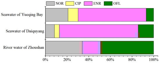 In this study, the river water from Zhoushan was dominated by OFL, which may be related to the discharge of domestic sewage and medical wastewater from surrounding residents. The seawater from Daiquyang and Yueqing Bay were both dominated by ENR, which may be due to the development of marine aquaculture around the investigated sea area. ENR, CIP and NOR are commonly used antibiotics in aquaculture, especially ENR, which is the most widely used []. These results were consistent with other similar studies where OFL was dominant in the groundwater of the Hutuo River, China [], influents and effluents of wastewater treatment plants (WWTPs) from Dalian, China [], and influent, effluent, and surface water samples from Hangzhou, China []. In contrast, ENR was dominant in natural waters adjacent to mariculture areas in the Laizhou Bay, Bohai Sea []. Nevertheless, affected by sampling time, region, and drug use habits, the surface water of Pudong New Area of Shanghai, China, was dominated by NOR and CIP [], lake water collected from Baiyangdian Lake, China, was dominated by FLU [], influents of WWTPs from Durban, South Africa, were dominated by CIP [], and aquaculture waters and surrounding water bodies located in north of Portugal were dominated by NOR []. In terms of concentration levels, different types of water bodies in different regions also differ greatly. The concentrations of QNs in river water and seawater in this study were below the middle level. The total concentrations of the detected QNs (mean: 2.088–5.183 ng/L) were significantly lower than those in influents and effluents from Dalian (1059.9 ± 1030.5 ng/L) [], influents from Durban (15770 ng/L) [], influent (2029 ng/L), effluent (778 ng/L), and surface water samples (83.5 ng/L) from Hangzhou [], surface water of Pudong New Area of Shanghai (64.63–151.99 ng/L) [], lake water from Baiyangdian Lake (153.1–955.24 ng/L) [], groundwater of the Hutuo River (77.52–153.93 ng/L) [], natural waters adjacent to mariculture areas in the Laizhou Bay, Bohai Sea (44.29–325.18 ng/L) [], and aquaculture waters and surrounding water bodies of Portugal (33.4 ng/L) []. The total concentrations of QNs were comparable to coastal waters in Korea (8.28 ng/L) [], surface water of the Yangtze River (1.38 ng/L) [], aquaculture water (2.95 ± 3.26 ng/L), Qin River water (3.09 ± 2.89 ng/L), and seawater (4.32 ± 0.49 ng/L) near the Maowei Sea []. More attention should be paid to the occurrence of QNs in environment water.