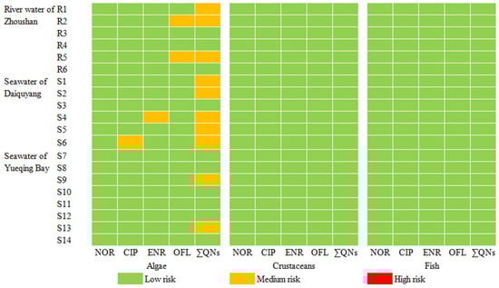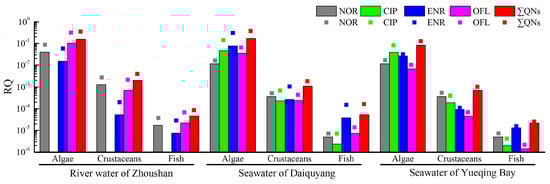 The details of the toxicity data and PNECs of the detected QNs are summarized in Supplementary Materials, Table S5, and the calculated RQ values for three different trophic levels of organisms (algae, crustaceans, and fish) are shown in Figure 5 and Figure 6. As can be seen, the maximum ΣRQ values of NOR, CIP, ENR and OFL for algae in the river water of Zhoushan and seawater of Daiquyang and Yueqing Bay are 0.36, 0.38, and 0.13, respectively, with average values of 0.16, 0.17, and 0.084, respectively. However, the maximum ΣRQ values for crustaceans and fish were both much less than 0.01, indicating that ΣQNs in the river water and seawater in the surveyed areas exhibited a low-to-medium risk to algae, and a low risk to crustaceans and fish. Overall, the ΣRQ values decreased continuously with the increase in trophic levels of aquatic organisms. The ecological risk of QNs to algae was mainly due to OFL in river water, while ENR and CIP were the main contributors in seawater, with maximum RQ values of 0.31, 0.31 and 0.14, respectively. More attention should be paid to the distribution level and exposure risk of these QNs in the environment. Antibiotic residues not only affect the behavior, reproductive capacity and growth of algae, crustaceans and fish, but also produce genotoxicity, even at trace levels, thus, antibiotic contamination control in environment water cannot be ignored []. In addition to the ecotoxicological effects, their long-term presence in the environment also creates selection pressure on microorganisms and contributes to the emergence of multi-drug resistant-bacteria [].