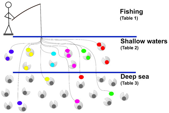Embedding-based alignment for GST protein classification. A reference protein set of well-curated proteins (described in Table 1) is adopted as baits for “fishing” ARBA GST classified proteins (testing set, in shallow waters, Table 2) and ARBA GST unclassified proteins (in deep sea, Table 3). For details, see text and Section 3. Color matching is indicative of the affinity of baits and preys.