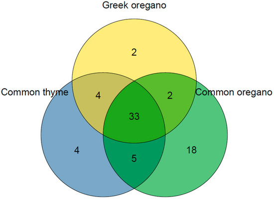 Sixty-eight compounds were identified among the EOs investigated, comprising 93.24–98.23% of the total fractions. Here, 46 compounds were identified in common thyme EO, 41 in Greek oregano EO, and 58 in common oregano EO (Figure 1). In common thyme and Greek oregano EOs, monoterpenes build the fundamental part. This group consisted of the following three subgroups: phenolic monoterpenes with the domination of thymol (up to 27.28% for common thyme) and carvacrol (up to 35.79% for Greek oregano); monoterpene hydrocarbons with γ-terpinene and p-cymene present in the highest amounts (11.67 and 18.20% for common thyme; 13.76 and 17.01% for Greek oregano, respectively); and oxygenated monoterpenes (up to 12.99% for common thyme and 6.65% for Greek oregano, respectively). In turn, common oregano EO was characterized by the domination of oxygenated sesquiterpenes (up to 35.80%), represented mainly by caryophyllene oxide (18.89%). Sesquiterpene hydrocarbons (e.g., β-caryophyllene, β-bourbonene, β-cubebene), followed by oxygenated monoterpenes (e.g., terpinen-4-ol, carvone, linalool), were present here in the considerable amounts, too (Table 2). In general, the dominant constituents, namely, carvacrol, p-cymene, thymol, and γ-terpinene, followed by caryophyllene oxide, β-caryophyllene, and terpinen-4-ol, differentiated the investigated EOs the most (Figure 2).