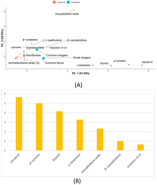 PCA map (A) and VIP values (B) from PCA analysis based on the chemical profiles of EOs.