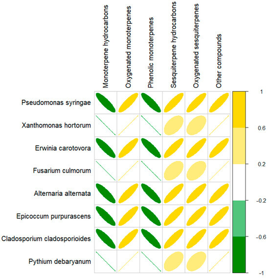 Figure 3 shows the Spearman rank correlation between antimicrobial activity and the EO chemical profile. It was observed that the growth of the examined strains (in particular, Xanthomonas hortorum, Fusarium culmorum, and Phytium debaryanum) was negatively correlated with the content of phenolic monoterpenes and monoterpenes hydrocarbons in the investigated EOs.