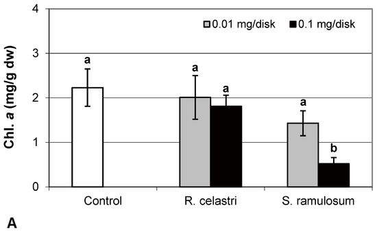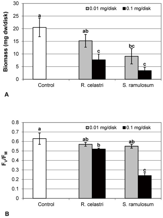 Biomass production (mg dw/disk) of two-week-old A. erici cultures decreased by the presence of extracts from R. celastri and. S. ramulosum in a quantitatively dependent manner (Figure 1A). While both tested quantities of S. ramulosom extracts significantly decreased photobiont growth, the lower tested amount of extract from R. celastri (0.01 mg/disk) was not strong enough to be significant.