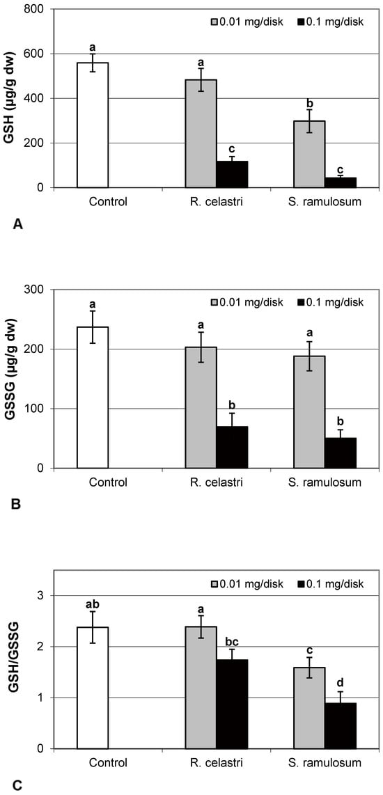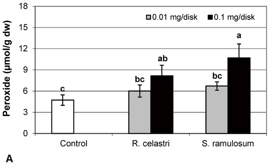Hydrogen peroxide (µmol/g dw) content (Figure 4A) and content (µg/g dw) of superoxide anion (Figure 4B) of two-week-old A. erici cultures increased by the presence of the highest tested (0.1 mg/disk) amount of extracts from R. celastri and. S. ramulosum. Production of TBARS (nmol/g dw) in two-week-old A. erici cultures increased by the presence of extracts from R. celastri as well as S. ramulosum in a quantitatively dependent manner (Figure 4C). While both tested quantities of S. ramulosom extracts significantly increased TBARS production, the increase in TBARS caused by the lower tested amount of extract from R. celastri (0.01 mg/disk) was not strong enough to be significant (Figure 4C).