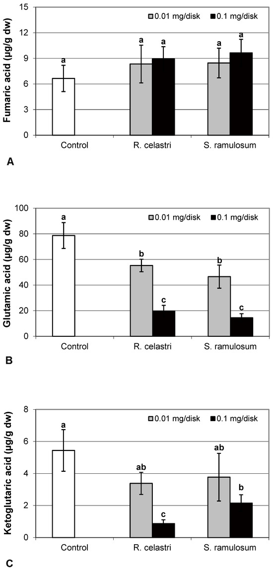 Content of fumaric acid ((A); µg/g dw), glutamic acid ((B); µg/g dw), ketoglutaric acid ((C); µg/g dw), and lactic acid ((D); µg/g dw) of 2-week-old photobiont Asterochloris erici cultures cultivated on disks with the addition of secondary metabolites extracts from lichens Ramalina celastri and Stereocaulon ramulosum (0.01 and 0.1 mg/disk). Values in vertical columns followed by the same letter(s) are not significantly different according to Tukey’s test (p < 0.05), n = 3.