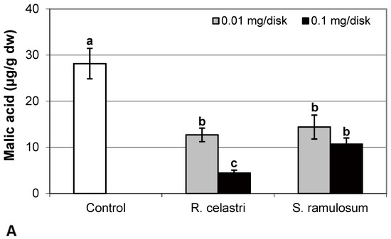 In the present study, we also analyzed the content of selected organic acids (µg/g dw) related to the Krebs cycle, or the so-called “citric acid cycle”. Citric acid content (Figure 5D) in two-week-old A. erici cultures decreased in a dose-dependent manner in the case of both tested lichen extracts; however, extracts from R. celastri were more effective when compared to identical amounts of extracts from S. ramulosum.