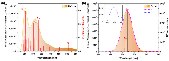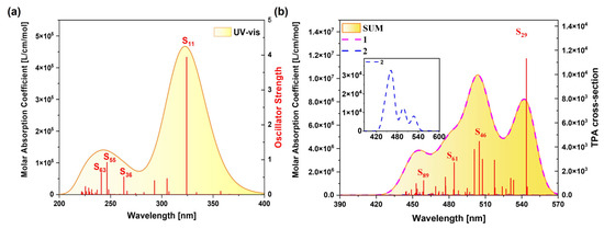 Figure 14a shows the single-photon absorption spectrum of MCNB2, whose spectral range is in the range of 210–560 nm, covering part of the ultraviolet and visible light regions. There are three absorption peaks in this spectrum, among which the absorption peak at 254.79 nm has the strongest intensity and is mainly contributed to by the excited state S84. Figure 14b is the two-photon absorption spectrum of MCNB2, with the spectral region in the range of 480–560 nm. Its absorption peaks are mainly contributed to by the excited states S86 and S87, and the two-photon spectrum is in the visible light region.