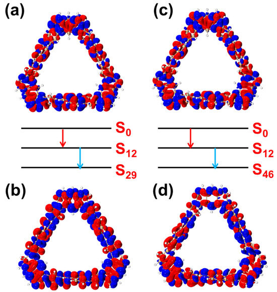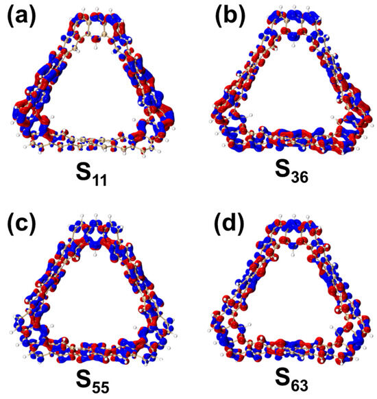 In the OPA spectrum, for the S11 state of the TMCNB, the electron and hole distributions are primarily localized on the left and right sides of the structure, and their distribution is uniform, exhibiting the characteristics of local excitation, as shown in Figure 4a. Under the other three excited states, electrons and holes are distributed across the entire structure, which also indicates local excitation. Additionally, the isosurfaces of electrons and holes are both positioned on the upper and lower sides of the benzene ring, corresponding to πout-πout* (out-of-plane π) excitation. The TDM diagram further reveals that the transition density is concentrated along the diagonal, confirming that the nature of the excitation in these states is local excitation, as shown in Figure S2a–d.
