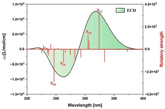 Figure 7 shows the ECD spectrum of the TMCNB, displaying two positive peaks and one negative peak in the range of 200–400 nm. The primary positive peak is mainly attributed to the excited states S11 and S15, while the negative peak is mainly contributed to by the excited states S36 and S55. To further analyze the electromagnetic interaction of the TMCNB in these excited states, a visual examination of TEDM and TMDM was carried out. As shown in Figure 8, Figure 8a,b present the isosurface distributions of TEDM and TMDM for the TMCNB in S11. The TEDM density exhibits a decreasing trend along the X, Y and Z directions, while the distribution of TMDM density shows a complementary relationship with TEDM. Specifically, the positive and negative isosurfaces of TEDM are predominantly located at the twisted positions where the three benzene rings are connected. In the X direction, the positive isosurface of TMDM is located above the molecule, and the negative isosurface is positioned above the molecule, while the negative isosurface is located at the lower right corner. In the Y direction, the positive isosurface is distributed in the central region of the long benzene chain, whereas the negative isosurface is distributed along the three shorter benzene chains. In the Z direction, the positive area appears on the left side of the molecule, while the negative area is found on the right side. The separation between the positive and negative TMDM densities is particularly pronounced in the Z direction. For the S15 state, the TEDM and TMDM isosurfaces are both small, indicating a weak oscillator strength for this transition. The isosurface distributions of TEDM and TMDM under S36 and S55 exhibit a similar pattern, with alternating positive and negative regions, as shown in Figures S5–S7. Figures S8 and S9 are the TDM diagrams of TEDM and the TMDM of the TMCNB, and the conclusions obtained are completely consistent with the isosurface diagrams.