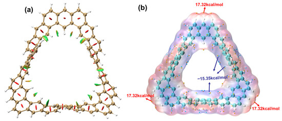 Figure 9a presents the IRI isosurface of the TMCNB. This isosurface does not represent the bonding region but only shows the weak interaction region. When the color of the isosurface is red, it indicates that there is a steric hindrance effect at this position. Thus, it can be inferred that there is a steric hindrance effect at the center of each benzene ring. If the isosurface color is green, it indicates van der Waals interactions in that region. Based on this, it can be inferred that there is some steric hindrance within the inner C rings of the TMCNB, while van der Waals interactions dominate between the H atoms.