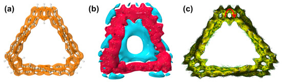 A localized orbital locator (LOL) is a real-space function that can be used to investigate the electronic delocalization path. LOLs can be further decomposed into LOL-π, which contributes to π electrons, to investigate the delocalization path and aromaticity of π electrons in a system. Figure 10a is the LOL-π isosurface diagram of the TMCNB. It can be found that the TMCNB shows a good global delocalization channel and has strong delocalization, which confirms that TMCNB is a fully conjugated structure with a single π surface (πout). The iso-chemical shielding surface (ICSS) is a real-space function closely related to the nucleus-independent chemical shift (NICS), which can clearly reveal the degree of magnetic shielding and deshielding effects of delocalized electrons in different regions and can be used to study the aromaticity of cyclic molecules. The red (blue) contour surface in Figure 10b represents the region that generates 5 ppm shielding (deshielding) for the external magnetic field in the Z direction. Through analysis, it is found that the main stem of the TMCNB is red, which belongs to the shielding area, while its surroundings and interior are deshielding areas. Through calculation, the ICSSZZ value at 1 Å above the molecular plane of the TMCNB is 45.8 ppm, which indicates that the TMCNB has aromaticity, and its aromaticity is mainly contributed by πout. Figure 10c is the anisotropy of the induced current density (AICD) of the TMCNB, which shows the direction of the annular induced current under the action of an external magnetic field. The circular current following the left-hand rule indicates its aromaticity. The circular currents on the benzene ring in the figure are all clockwise, so it has aromaticity. However, in the overall macrocycle, although there is a complete electronic delocalization channel, the direction is irregular, so the TMCNB has local aromaticity.