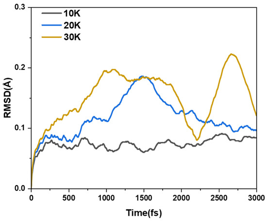 RMSD diagrams of MCNB2 at temperatures of 10 K 20 K and 30 K.