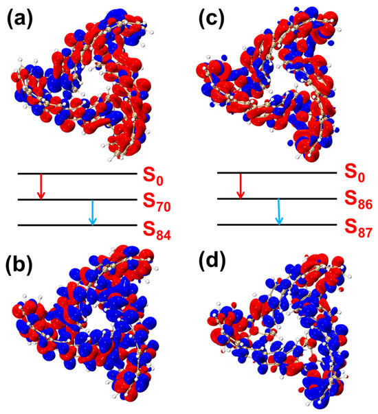 Figure 16 presents the TDM diagrams and electron–hole density diagrams for the two-step transitions of the excited states that significantly contribute to the two-photon absorption peak of MCNB2. Among them, Figure 16a,b depict the two-step transition process of S0–S86. The initial transition, S0→S84, shows a prominent bright region along the main diagonal in the TDM diagram, indicating local excitation, as confirmed by the electron–hole density analysis (Figure 16c). In the second transition process, S84→S86, the separation between electrons and holes is substantial, with electrons predominantly located at the top of the molecule and holes in the central region, highlighting clear charge-transfer excitation. This charge-transfer nature is further supported by the bright regions outside the main diagonal in the TDM diagram. Figure 16c,d present the two-step transition process of S0–S87. The transition from S0 to S70 exhibits a combination of local excitation and charge transfer, with alternating electron and hole isosurfaces. However, the isosurface of holes is more than that of electrons. It can be inferred that electrons have transitioned to the area outside the molecule. The transition from S70 to S87 is primarily characterized by charge transfer, with a higher electron density and fewer holes. The corresponding TDM diagrams are provided in Figure S13.