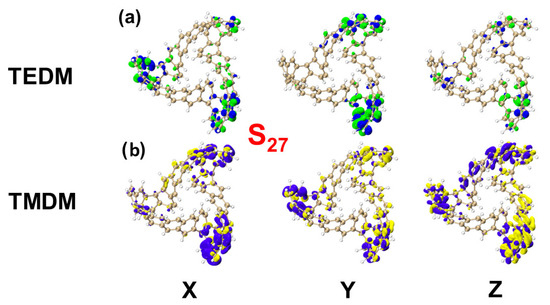 The TEDM/TMDM isosurfaces of MCNB2 in the excited states of S27 (a,b). The blue and green isosurfaces represent the positive and negative TEDM, respectively, and the yellow and purple isosurfaces represent the positive and negative TMDM, respectively.