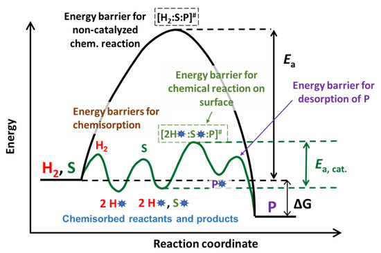 The term [2H*:S*:P]# in Figure 1 represents an intermediate in the catalytic hydrogenation process. For comparison, a non-catalytic reaction coordinate includes an intermediate [H2:S:P]#. The essence of “catalysis“ lies in overcoming a much lower energy barrier (Ea,cat.) compared with a non-catalyzed reaction (Ea). From a kinetic perspective, the reaction rate is typically determined by the slowest step, which usually involves the highest energy barrier [5,50]. The rate-determining step of the process could be one of the following: