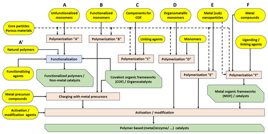 Based on data from the literature ([41,42,83,84,85,86,87,88,89,90,91,92,93,94,95,96,97,98,99]) and our experience ([54,55,76,100,101,102,103,104,105,106,107,108,109,110,111,112,113,114]), we prepared a comprehensive overview of the preparation of OMOP-based catalysts (Figure 3). The preparation routes are divided into two main groups as follows: A–C, which starts from pure organic monomers, and D–F, which involves metal compounds or even metal nanoparticles at the start (route E). The difficulty, complexity, and cost of the resulting catalysts increase from A to D. The characteristics of routes E and F depend on the type and cost of the starting materials. Although Figure 3 also includes the preparation of enzyme-heterogenized catalyst, this area will not be discussed further in this text, despite the availability of relevant published data [115,116,117].