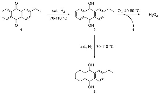 It is important to note that non-catalytic hydrogenation reactions with hydrogen typically occur only at higher temperatures, approximately above 500 °C, and are often accompanied by a series of more complex reactions, e.g., hydrogenolysis and cracking. Non-catalytic hydrogenations at lower temperatures can proceed when hydrogen is transferred from/through a donor molecule, as seen in the non-catalytic liquefaction of coal [51]. Figure 1 illustrates the most commonly occurring heterogeneous catalytic process, modeled by the reaction of chemisorbed reactants. These models are known as Langmuir–Hinshelwood–Houghen–Watson (LHHW) models, sometimes named in abbreviated form as Langmuir–Hinshelwood (LH) models [1,50]. Another type of catalytic process, in which one of the reactants is chemisorbed on a catalytic surface and another reactant attacks the chemisorbed reactant, is the Elley–Rideal model [11]. A distinct group of catalytic processes is represented by Mars–van Krevelen redox models. In these processes, a reactant, such as oxygen, is incorporated into the catalyst’s structure, and the incorporated species (chemically bound) subsequently reacts with another reactant [11]. Examples of the latter processes include the oxidation of SO2 to SO3, benzene to maleinanhydride, naphthalene to phthalanhydride, etc. [11,15], typically catalyzed by transition metal oxides, often vanadium. The Mars–van Krevelen (MvK) mechanism is characterized by changes in the valence state of the transition metals used, such as when the average oxidation state of vanadium changes between 4 and 5. It is necessary to add that the MvK mechanism occurs at temperatures higher than 200 °C, and for OMOP-type catalysts, it is not described in the available literature. LH and ER mechanisms govern catalysis with OMOPs [11,50].