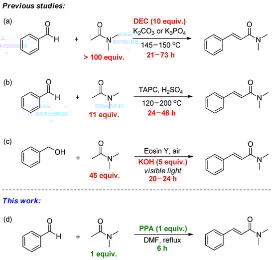 Considering the limitations of the above approaches, the convenient preparations of cinnamides are highly desired. In 2010, the direct aldol condensation of unactivated amides catalyzed by dialkylcarbonates (DECs), as dehydrating agents, was reported (Scheme 1a) [26]. Later, Saito and co-workers reported a similar strategy for the preparation of cinnamides using 1,3,5-triazo-2,4,6-triphosphorine-2,2,4,4,6,6-hexachloride-based phosphorous (TAPC)/SO42− catalysis (Scheme 1b) [27]. Despite significant progress, the lowest acidity of the α-CH of amides results in major shortcomings such as the excessive use of dehydrating agents and amides, and the requirement of long reaction times (Scheme 1a,b). Recently, Cai and co-workers developed a visible light-promoted oxidative cross-coupling reaction of benzyl alcohols with N,N-dialkylacetamides for the construction of cinnamides; however, this strategy still needs excessive base and amides, as well as a long reaction time (Scheme 1c) [28]. Hence, the development of new synthetic strategies devoid of these disadvantages is still urgent.