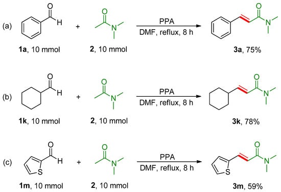 Gram-scale reactions. Gram-scale reactions of benzaldehyde 1a (a), cyclohexanecarboxaldehyde 1k (b), and 2-thenaldehyde 1m (c). Reaction conditions: PPA (10 mmol) and DMF (10 mL).