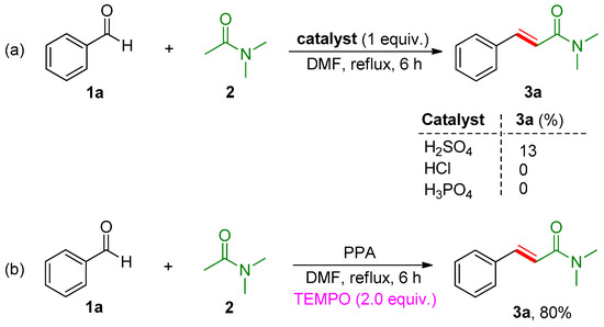 Initially, we set up the reaction benzaldehyde 1a and N,N-dimethylacetamide 2 as test substrates. A mixture of 1a (1 equiv.), 2 (1 equiv.), and PPA (2 equiv.) in DMF refluxed for 4 h under a nitrogen atmosphere produced the cinnamide 3a in a 46% yield (Table 1, entry 1). Screening of the amount of PPA showed that 1 equiv. was the best choice (Table 1, entries 2–4). Then, we investigated the influence of reaction temperature, and a decreased yield was observed upon decreasing the temperature to 140 °C (Table 1, entry 5 vs. 3). Subsequently, we tested the effect of the reaction time (Table 1, entries 6–8). To our delight, the reaction was found to be more effective when the reaction time increased to 6 h, which gave the desired product in a 79% yield (Table 1, entry 7). Next, we screened a serious of reaction media, such as 1,4-dioxane, THF, toluene, DCE, DMSO, and EtOH, and no improvement in the transformation was observed (Table 1, entries 9–14). Finally, the optimized reaction conditions were determined as 1a (1 equiv.), 2 (1 equiv.), and PPA (1 equiv.) in DMF refluxed for 6 h under a nitrogen atmosphere (Table 1, entry 7).