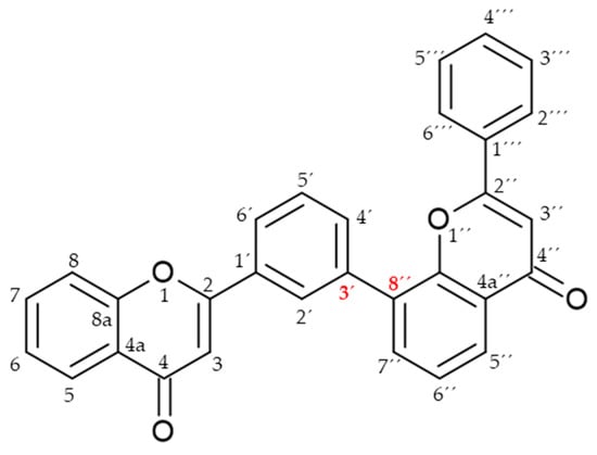 Biflavonoids or flavonoid dimers are a class of flavonoids that have been known for almost 100 years, since the first biflavonoid–ginkgetin was isolated from yellow ginkgo leaves in 1929 [10]. Biflavonoids are much less studied compared to monomeric flavonoids, although studies show a wide range of pharmacological activities, including anti-inflammatory, antioxidant, antibacterial, antiviral, antidiabetic, antitumor, cytotoxic, and neuroprotective properties [11]. According to He et al. [11] nearly 600 different biflavonoid structures have been described, which can be divided into two groups: C-C and C-linear fragments-C biflavonoids, depending on whether the linker between the two residues contains an atom. The C-C type contains different subtypes, which can be divided according to the position of their combinations into: 2-3″, 2′-2‴, 2′-6″, 2′-8″, 3-3″, 3-3‴, 3′-3‴, 3′-4‴, 3′-5″, 3-6″, 3′-6″, 3-7″, 3′-7″, 3-8″, 3′-8″, 4-6″, 4-8″, 4′-8″, 5-5″, 6-6″, 6-γ, 6-8″, 7-7″, and 8-8″. The group of biflavonoids in which two flavones are linked by a 3′-8″ C atom (Figure 1) includes the first isolated biflavonoid ginkgetin, derivatives of amentoflavone, and various other compounds that possess biological activity.