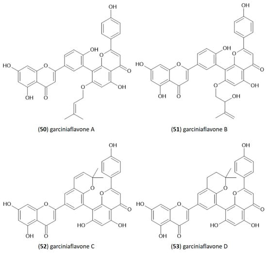 In the structure of 3′-8″-biflavones, the carbon–carbon double bonds C2-C3 and C2″-C3″ can be readily hydrogenated, resulting in a wide range of naturally occurring hydrogenation products (Table 2). Similarly to monomeric flavones, biflavones can also occur in a prenylated form, such as in plants of the genus Garcinia, from which several different prenylated 3′-8″-biflavones have been reported [29], and the structure of which is shown in Figure 2. Prenylated forms of biflavonoids are considered very rare in nature, and data have been reported only in Garcinia sp.