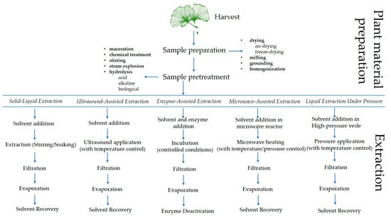 To develop a successful extraction method, formulation and optimization, evaluation, and standardization of process variables are required. This is the only way to achieve a reproducible and efficient extraction process [192]. When it comes to extraction processes, the choice of solvent, liquid/solid ratio, temperature, extraction time, and plant material size are likely to be the starting point for process design and optimization [188]. When using novel methods such as ultrasound-assisted extraction (UAE), enzyme-assisted extraction (EAE), microwave-assisted extraction (MAE), and liquid extraction under pressure (PLE), some additional variables such as ultrasound frequency and power, microwave power, solvent amount, pressure, etc., should be considered [188]. To find the optimal conditions, it is necessary to optimize each process individually due to the different characteristics of biflavonoids and the sources [192,193,194,195]. Figure 4 illustrates the biflavonoid extraction process from plant material, highlighting the various steps involved in the procedure.