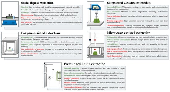 Comparison of extraction methods used for biflavonoids—advantages (green) and disadvantages (red).