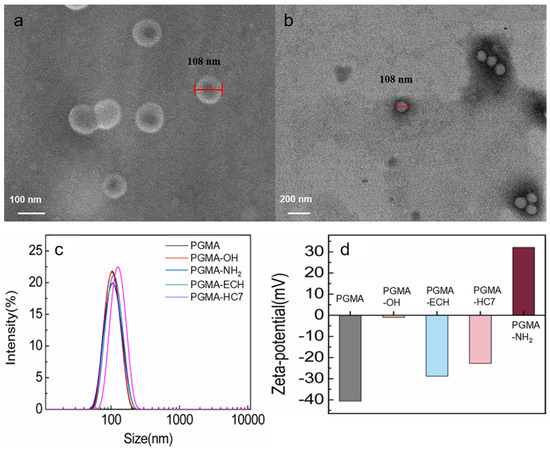 The SEM and TEM images of PGMA-HC7 nanospheres. (a) SEM at magnifications of 500 nm and (b) TEM at magnifications of 200 nm. Size distributions (c) and Zeta potentials (d) of different nanospheres.