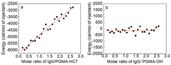 In order to determine the binding affinity between PGMA-HC7 nanospheres and IgG, the free energy of IgG binding to PGMA-HC7 nanospheres was determined by an ITC assay (VP-ITC, MicroCal, Amherst, MA, USA). Briefly, a drop of the IgG solution (139 µM) was injected into the PGMA-HC7 suspension (with the HC7 of 10 µM), and 25 injections with 8-min intervals were performed for each titration. All titration experiments were conducted at 37 °C. The PGMA-OH nanospheres were used as the control. The titration data were used to fit the parameters of the binding phenomenon to calculate the binding constant (Kb) [50].