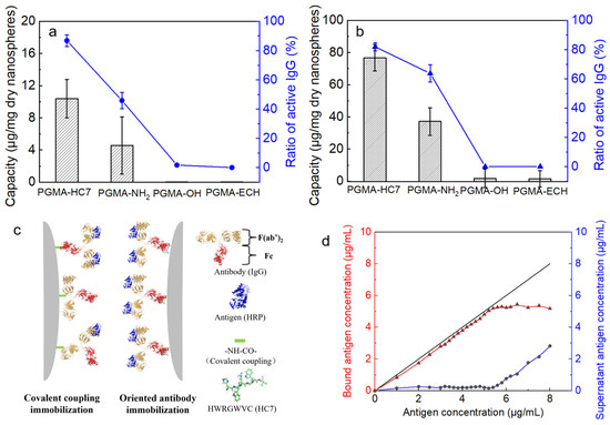 It is noteworthy for the immobilization of rabbit anti-HRP IgG and human anti-β2-MG IgG, PGMA-HC7 nanospheres achieved 10–80 ug/mg dry nanospheres (Figure 5a,b), but the HC7-modified PGMA microspheres only reached ~30 ng/mg dry microspheres for anti-HRP IgG immobilization [22]. In other words, the immobilization capacity of the PGMA-HC7 nanospheres was 1000-fold higher than that of the HC7-modified PGMA microspheres (ug/mg dry nanospheres vs. ng/mg dry microspheres). Moreover, the ratio of active antibodies of the former was 10-fold higher than that of the latter (~80% vs. 7%) [22]. These results further corroborated that the nonporous PGMA-based nanospheres performed higher efficiency in antigen recognition over nonporous PGMA-based microspheres. Additionally, both the immobilization capacity and the ratio of active antibody on PGMA-HC7 nanospheres were much higher than those on other HWRGWVC-linked nanoparticles [29], whose immobilization capacity and the ratio of active antibody were only about 1.5 ug/mg and 50%, respectively [27,29,44].