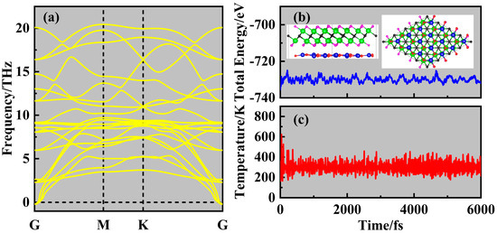 (a) The phonon spectrum of the ZnO/Sc2CF2 heterostructure. The variations in (b) energy and (c) temperature of the ZnO/Sc2CF2 heterostructure during the AIMD simulation at 300 K; the insert shows its final snapshot.